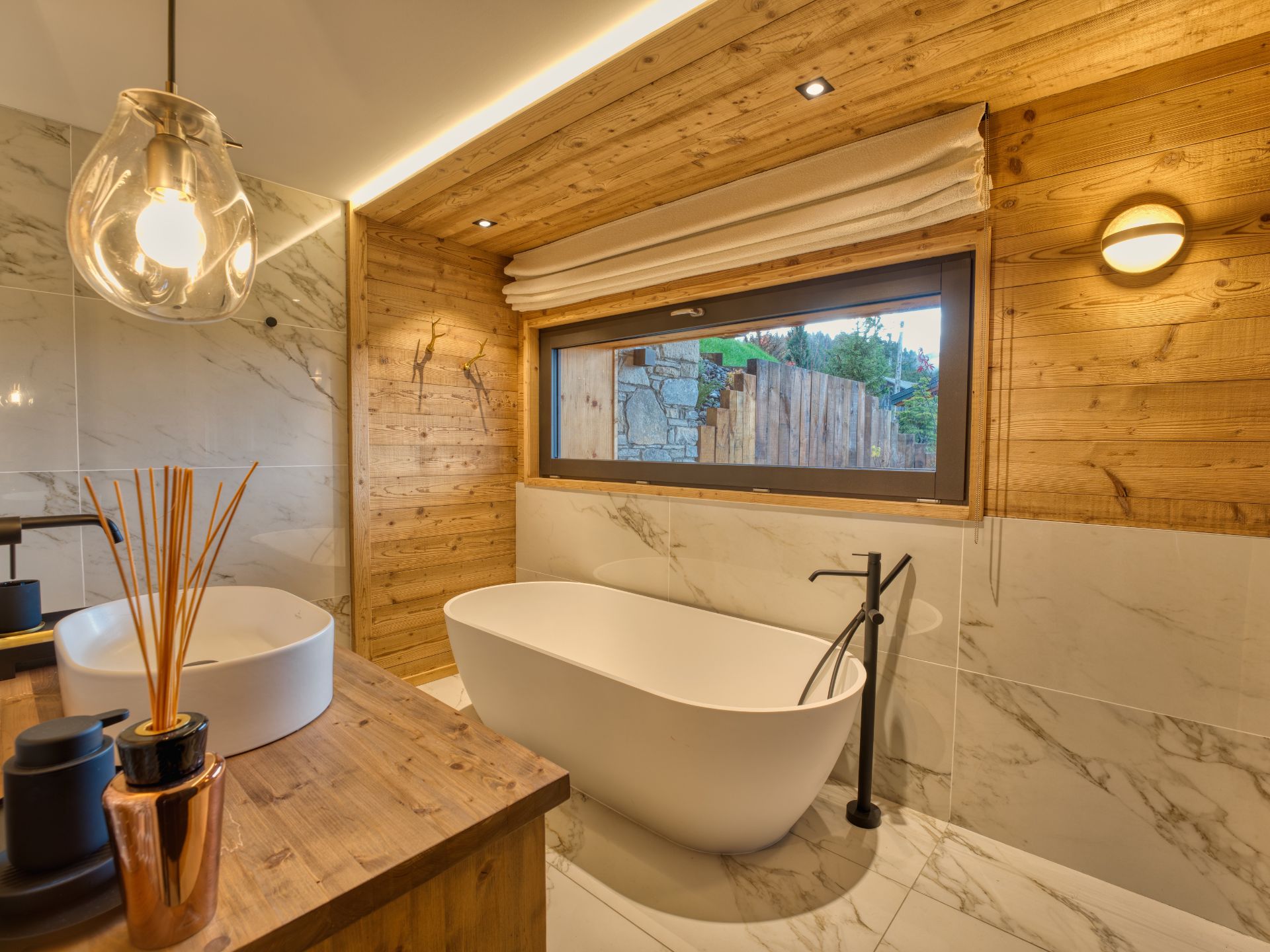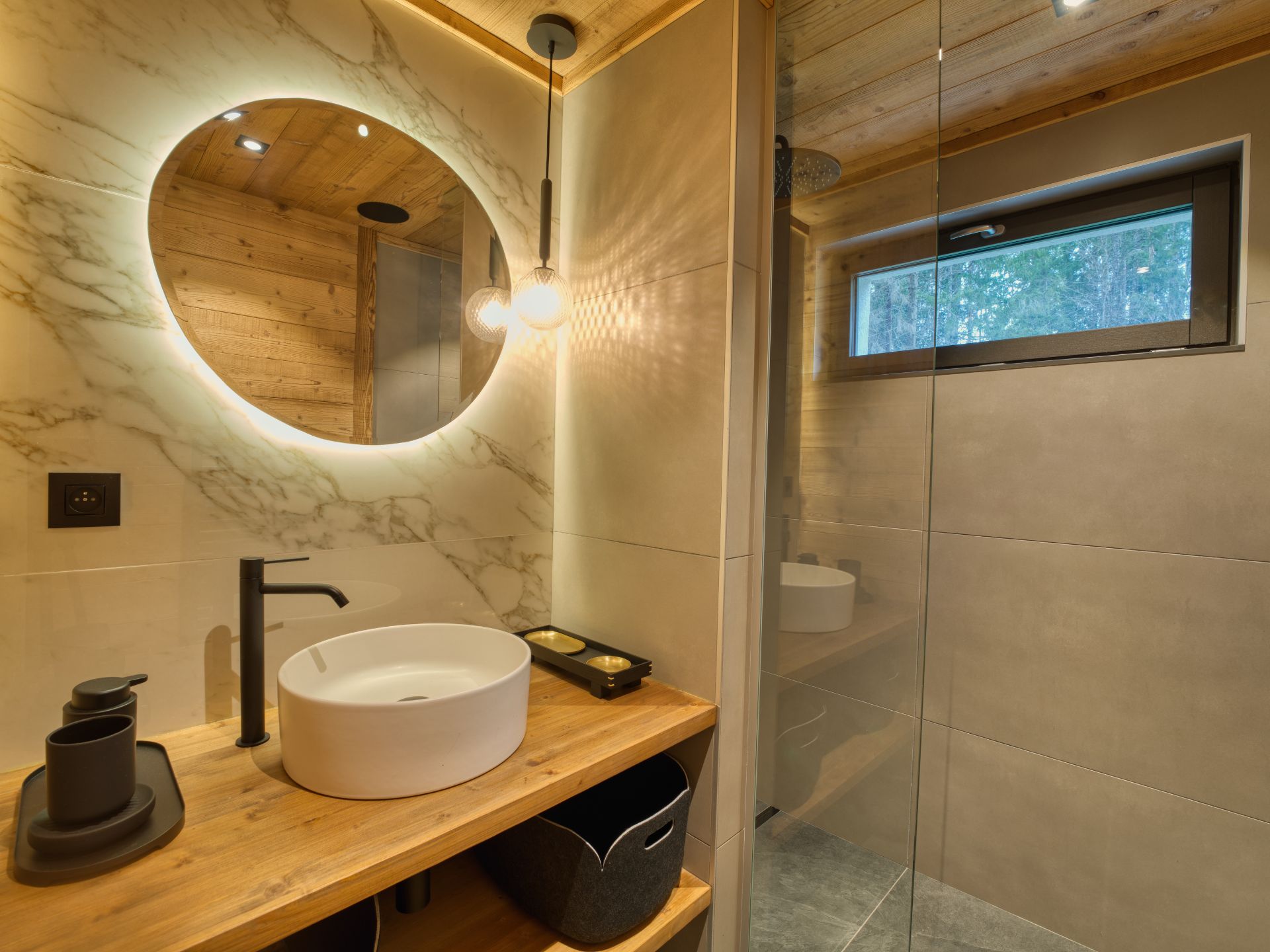 On the lower level, you will find the chalet’s sleeping area, which features 4 bedrooms, each with its own en-suite shower room. Three of them are double bedrooms, including the Master bedroom, which benefits from both a bathtub and a shower. The fourth bedroom offers two bunk beds (100x200), providing a total of 4 sleeping spaces. A laundry area with washing machine and tumble dryer, as well as a separate toilet, complete this level.
