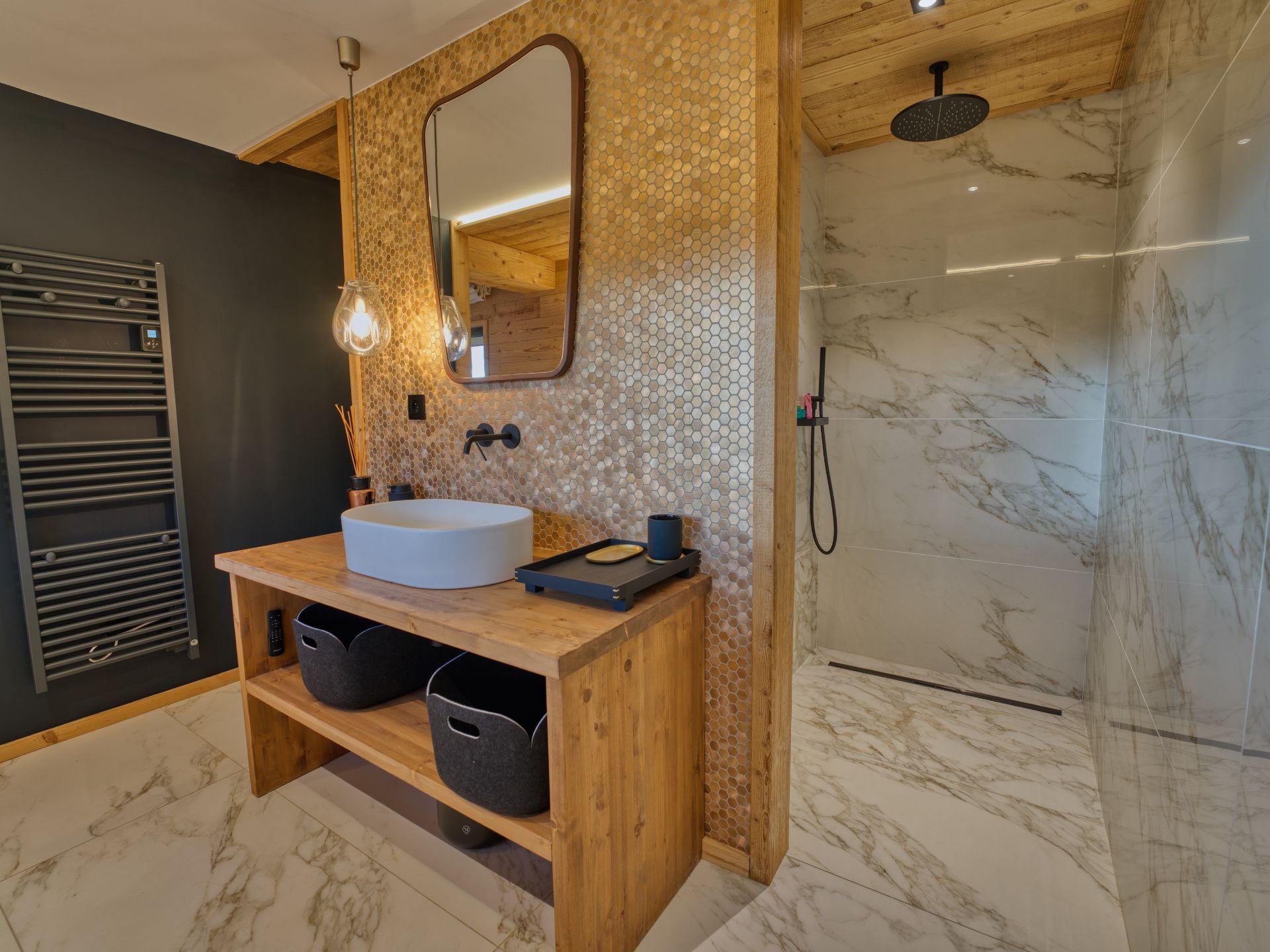 On the lower level, you will find the chalet’s sleeping area, which features 4 bedrooms, each with its own en-suite shower room. Three of them are double bedrooms, including the Master bedroom, which benefits from both a bathtub and a shower. The fourth bedroom offers two bunk beds (100x200), providing a total of 4 sleeping spaces. A laundry area with washing machine and tumble dryer, as well as a separate toilet, complete this level.