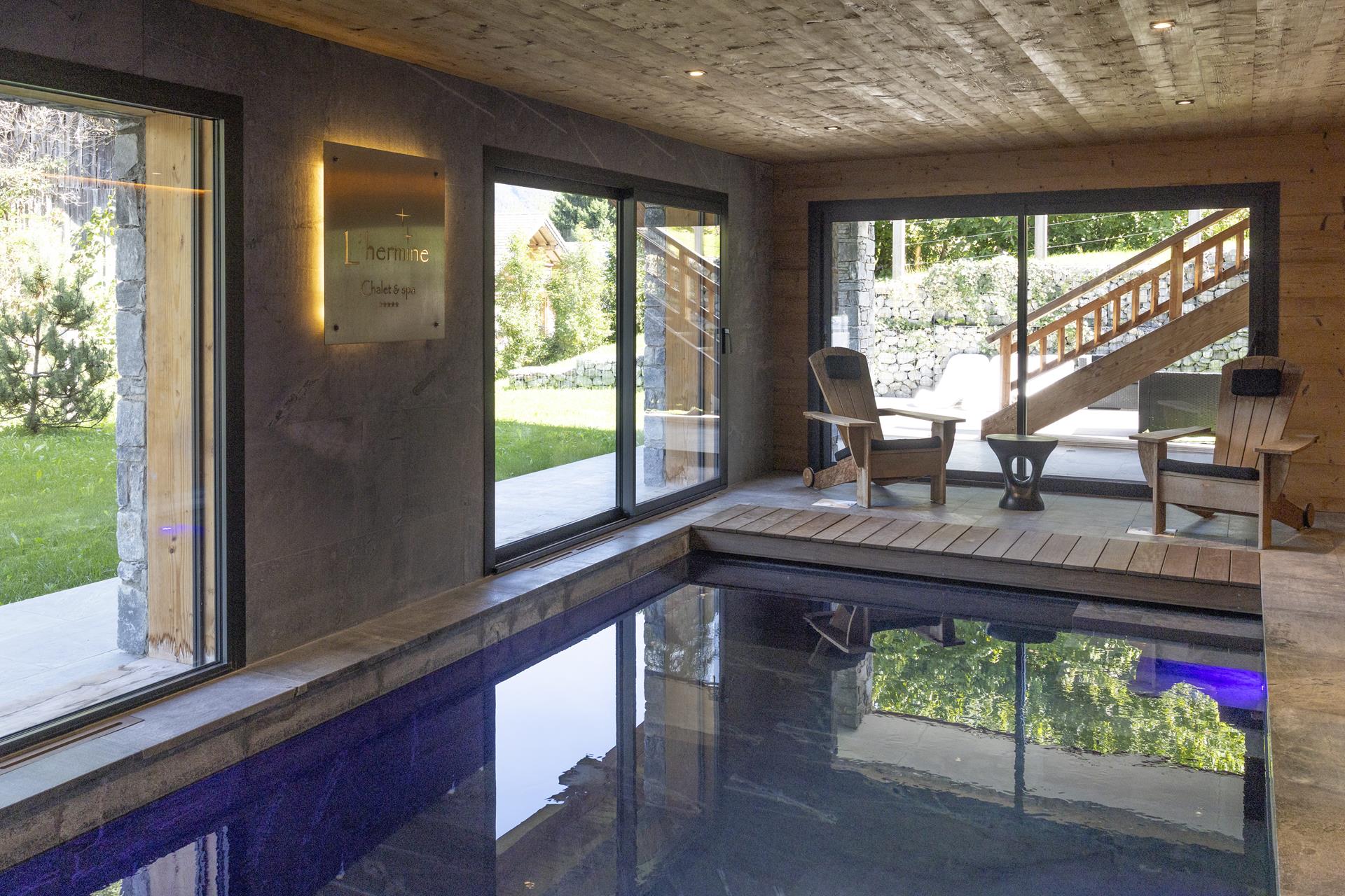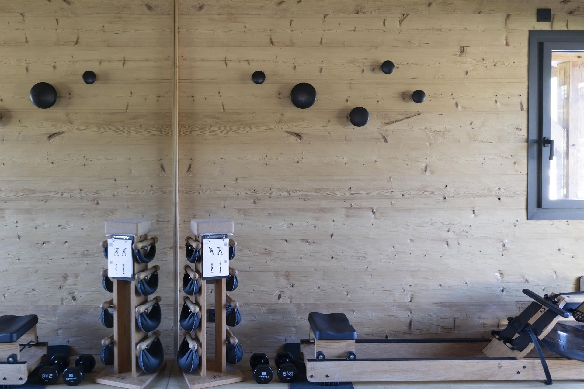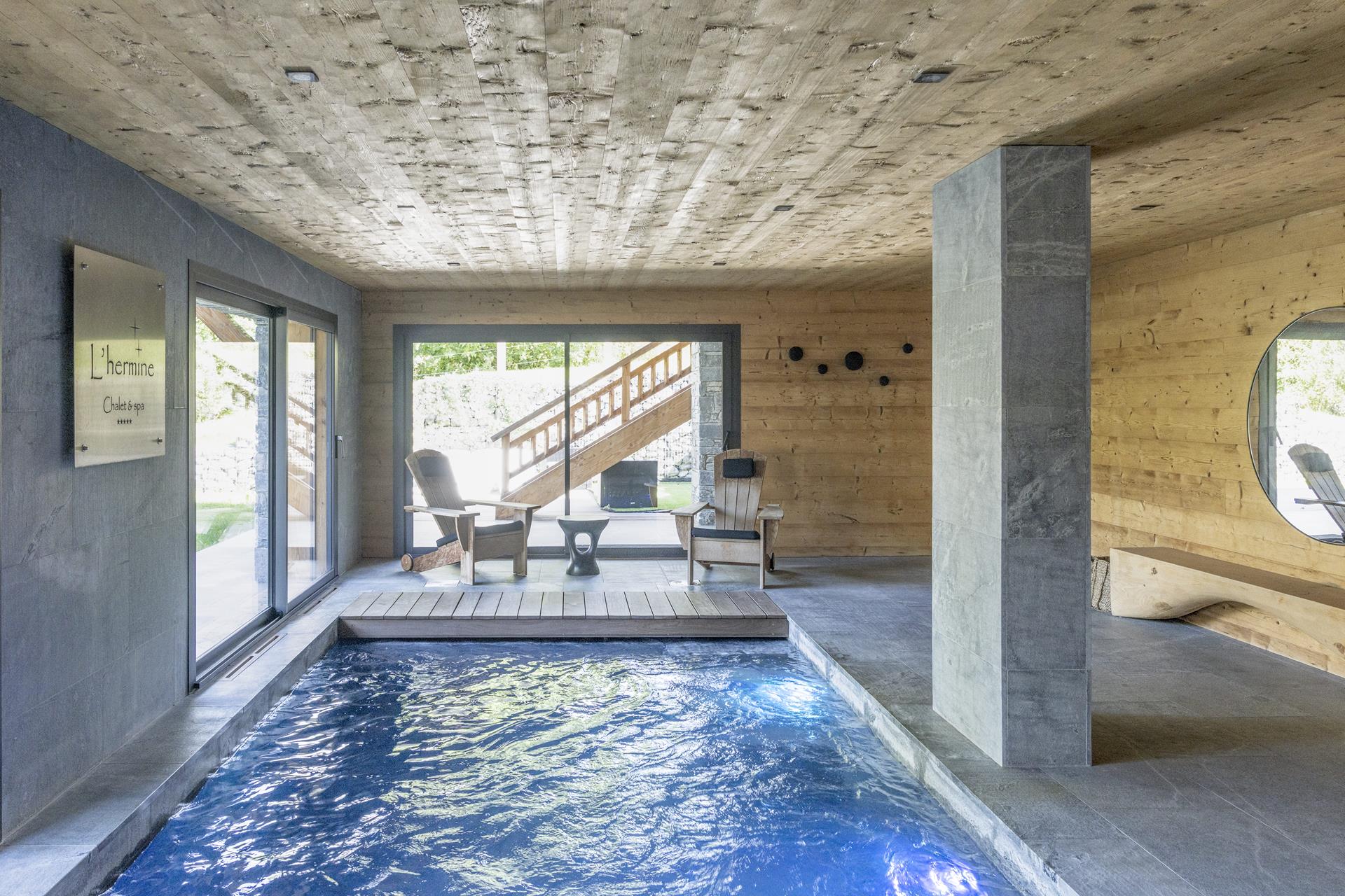 Sur ce même niveau, vous serez charmé par l’espace bien-être du chalet Dolmenite avec sa piscine intérieure chauffée avec fonctions nage à contre-courant et jets hydromassants, d’un hammam, d’une douche et d’une salle de fitness avec rameur, tour de poids, plateau d’équilibre... Le tout avec accès à une terrasse avec vue sur la montagne. Une buanderie ainsi qu’un toilette invité complète ce niveau.