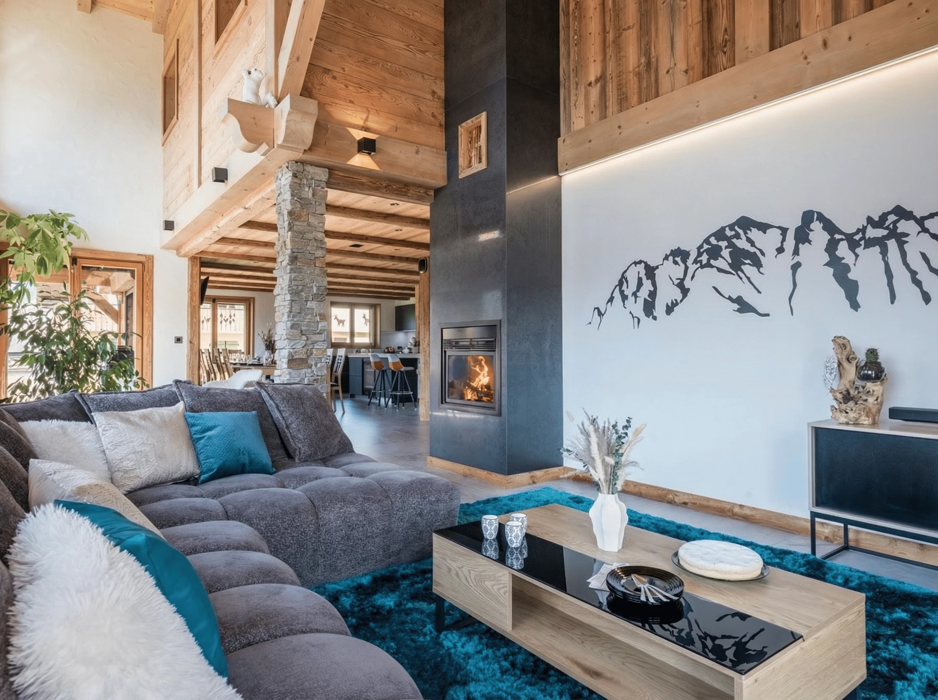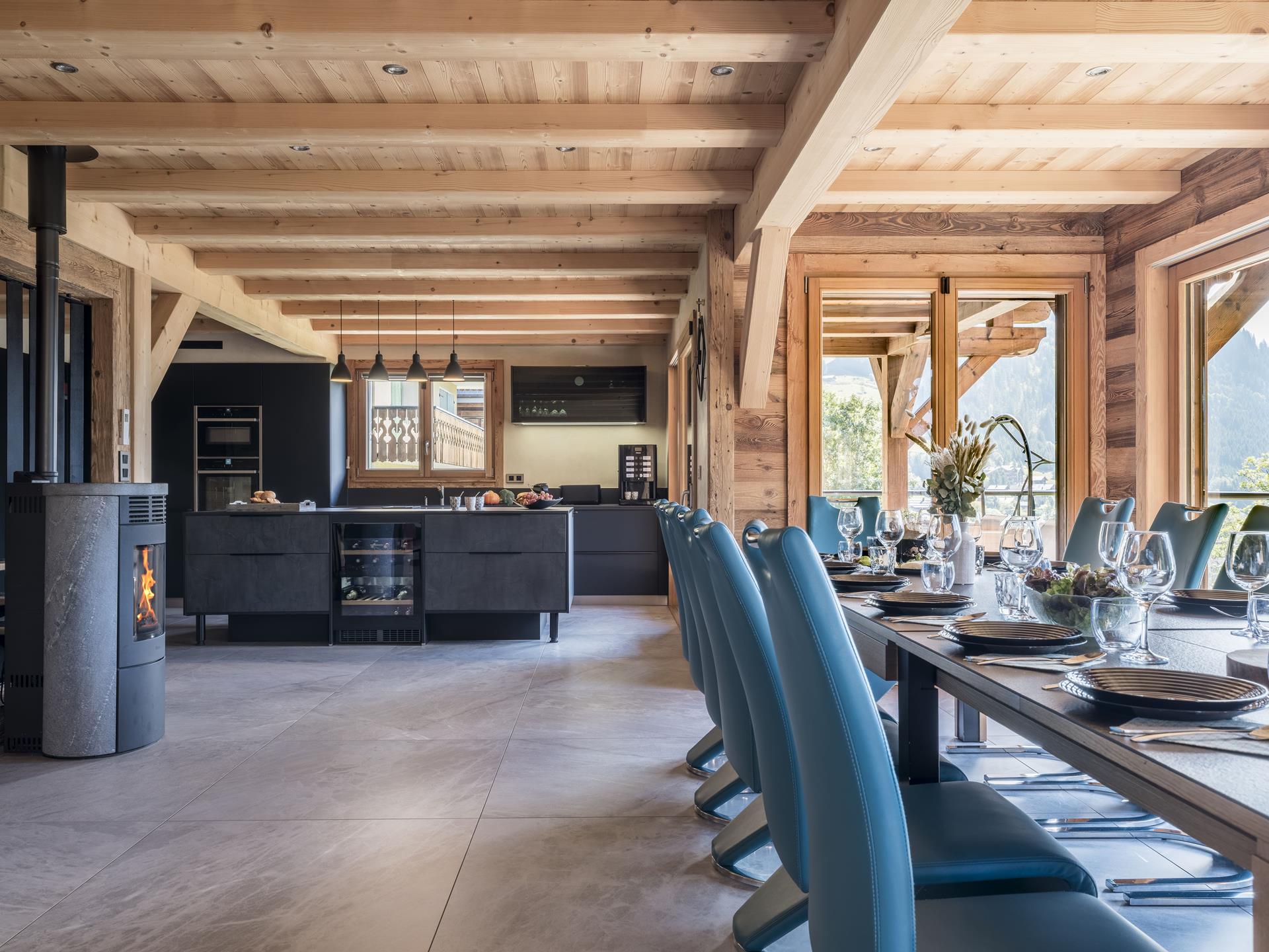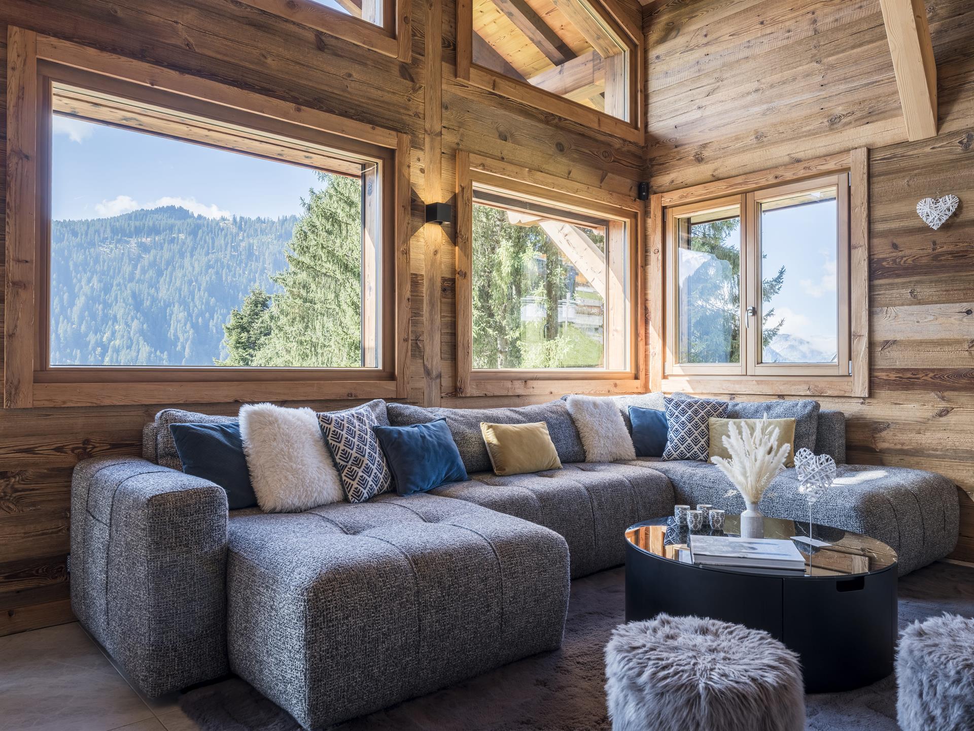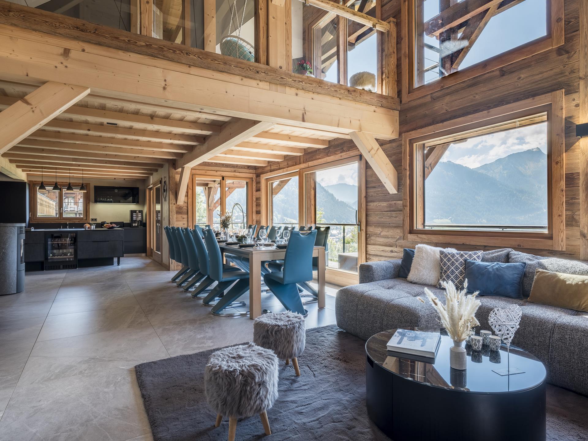 L'espace de vie du chalet se trouve à l'étage R-1. Elle se compose d'une cuisine équipée ouverte sur le salon avec bar et îlot central, le tout avec vue sur les montagnes. Admirez la vue depuis le grand canapé du salon, ou partagez un repas en famille à la table de 14 places. Le salon dispose également d'une cheminée à pellets pour réchauffer l'atmosphère et égayer vos soirées. Dans le prolongement du salon, on accède à la terrasse de 50 m2 orientée au sud-est, idéale pour se prélasser au soleil ou simplement contempler la nature environnante. Une chambre double complète le niveau, ainsi qu'un espace cinéma pour les cinéphiles.
