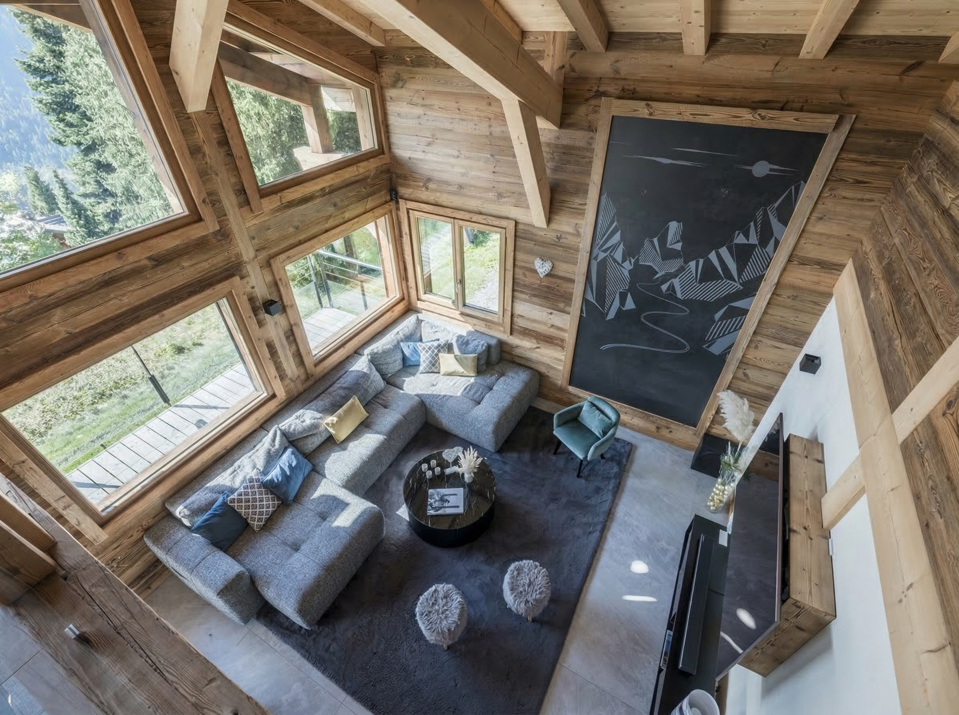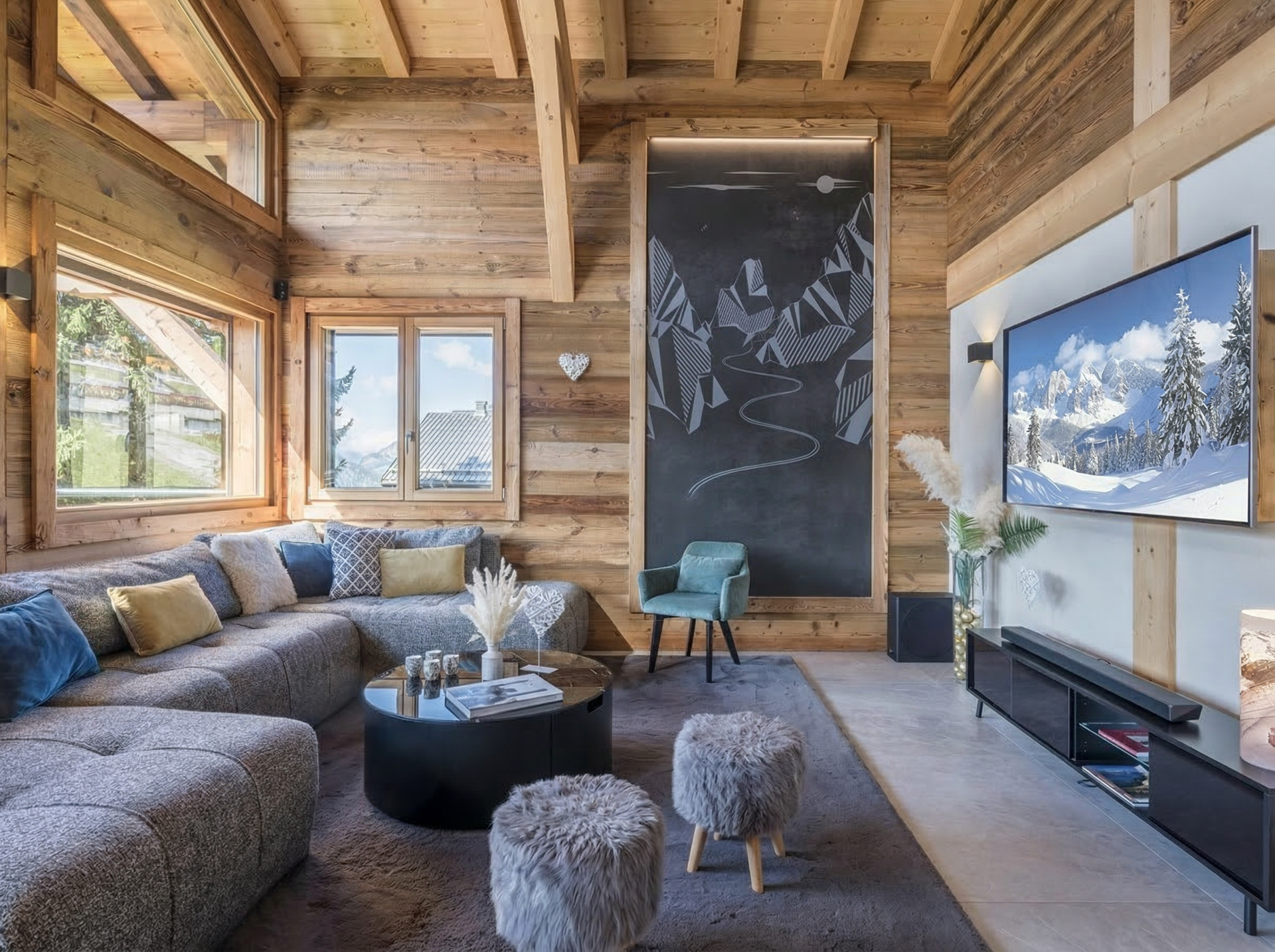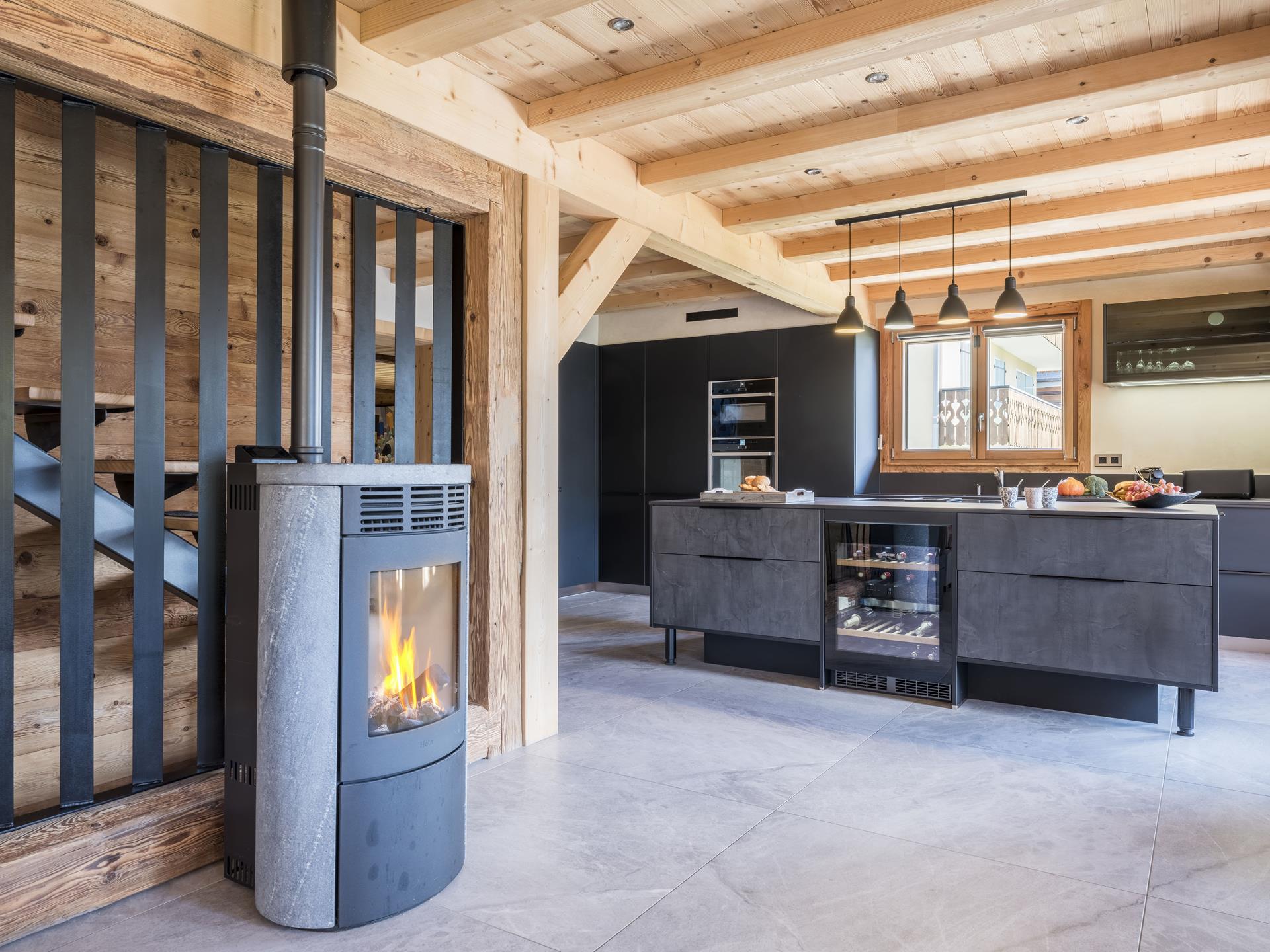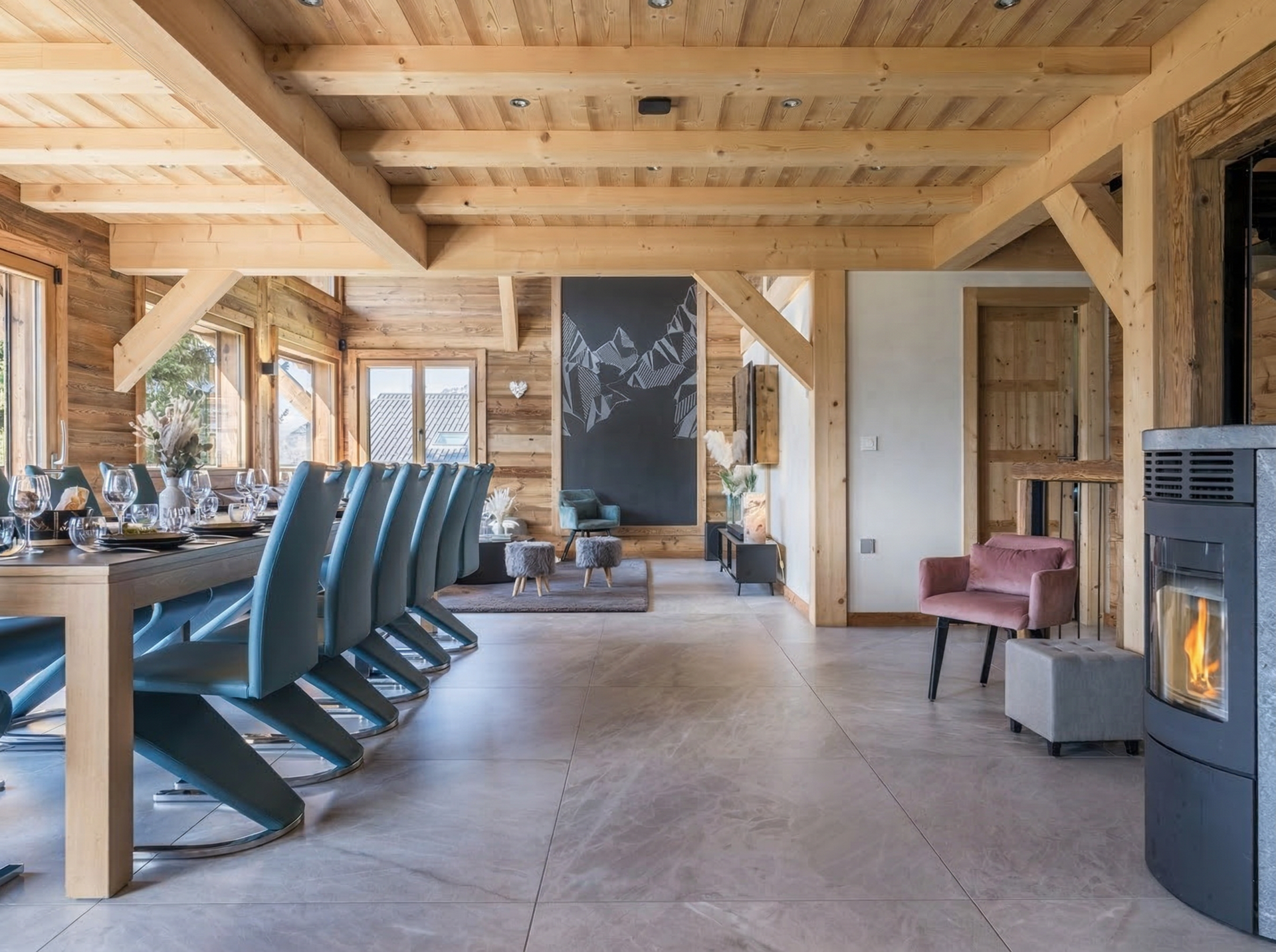 L'espace de vie du chalet se trouve à l'étage R-1. Elle se compose d'une cuisine équipée ouverte sur le salon avec bar et îlot central, le tout avec vue sur les montagnes. Admirez la vue depuis le grand canapé du salon, ou partagez un repas en famille à la table de 14 places. Le salon dispose également d'une cheminée à pellets pour réchauffer l'atmosphère et égayer vos soirées. Dans le prolongement du salon, on accède à la terrasse de 50 m2 orientée au sud-est, idéale pour se prélasser au soleil ou simplement contempler la nature environnante. Une chambre double complète le niveau, ainsi qu'un espace cinéma pour les cinéphiles.