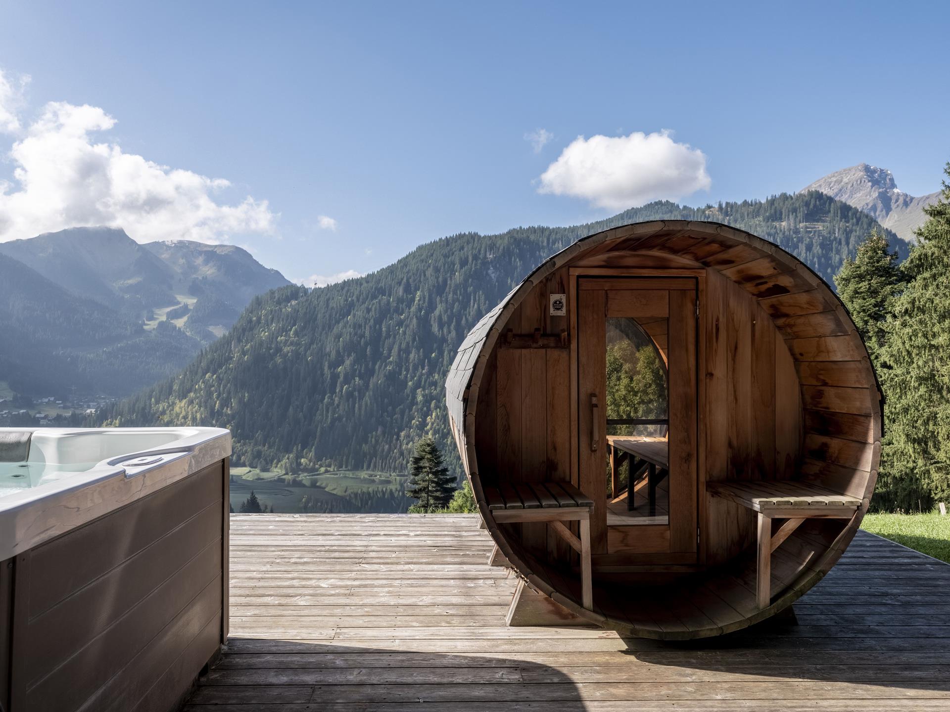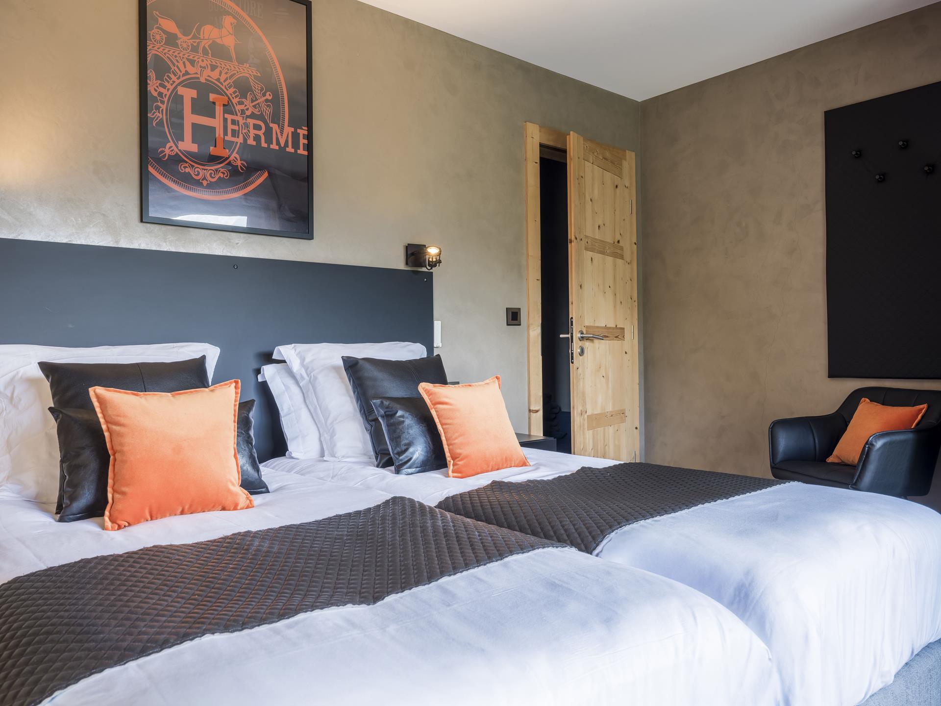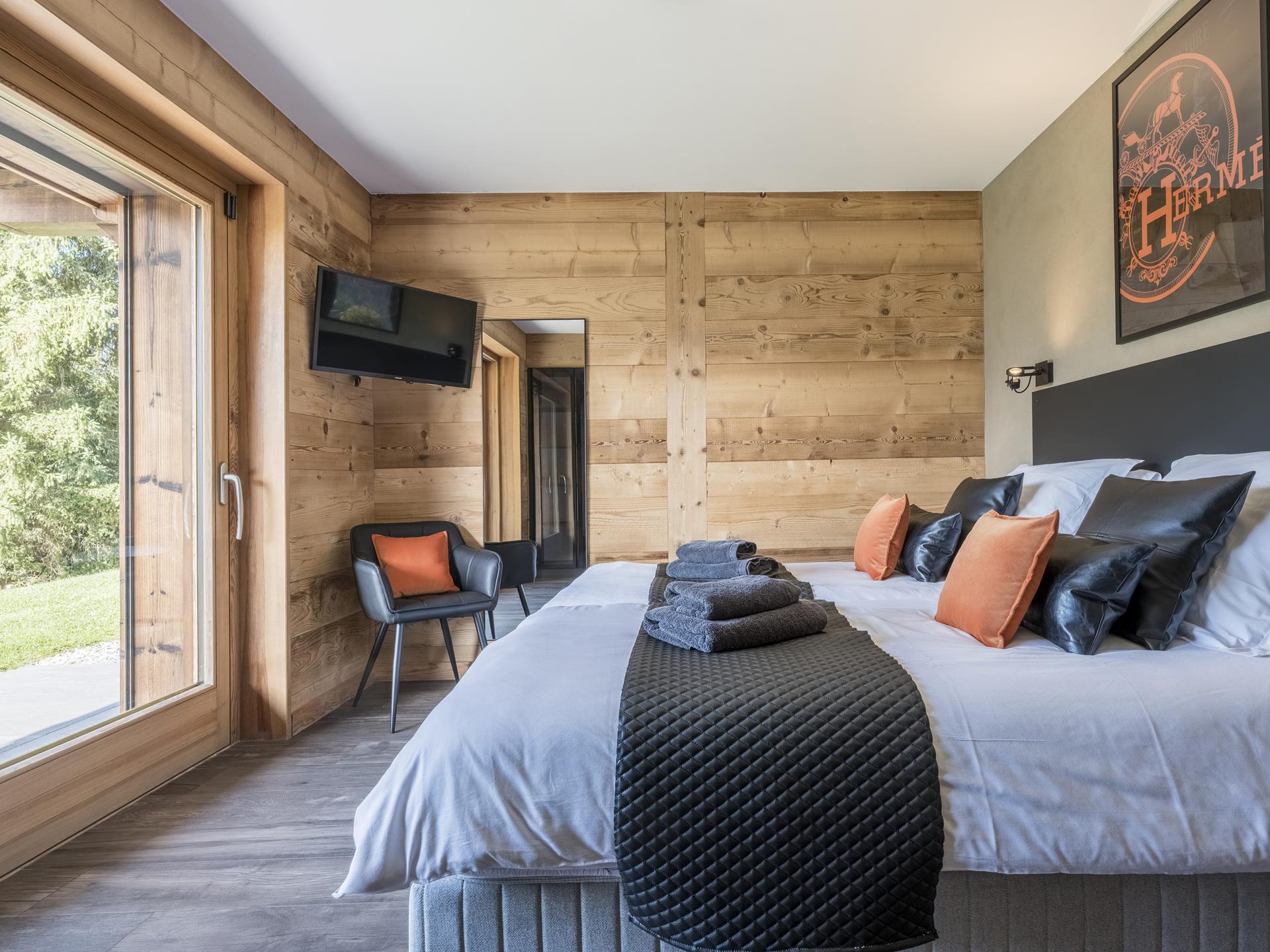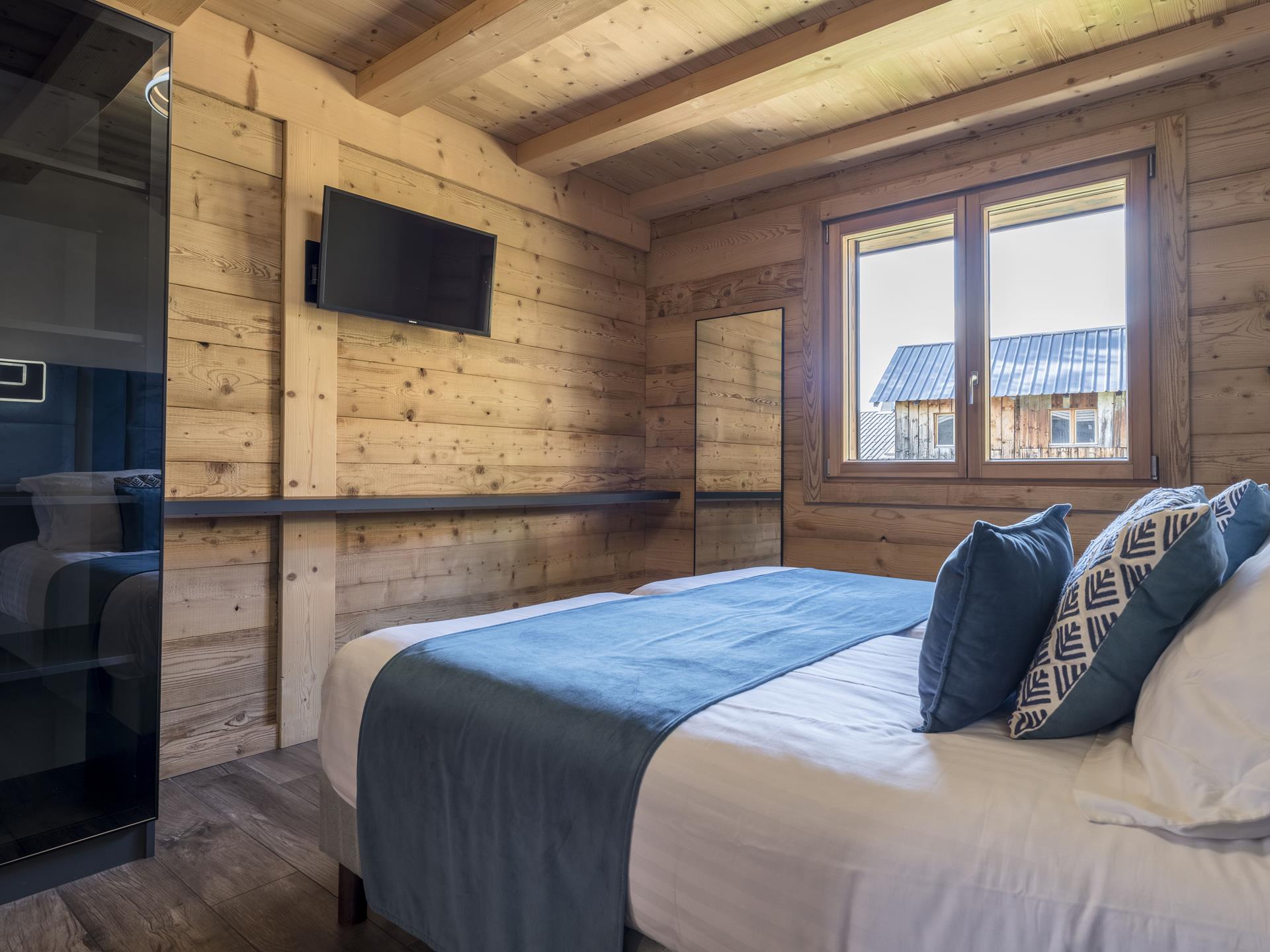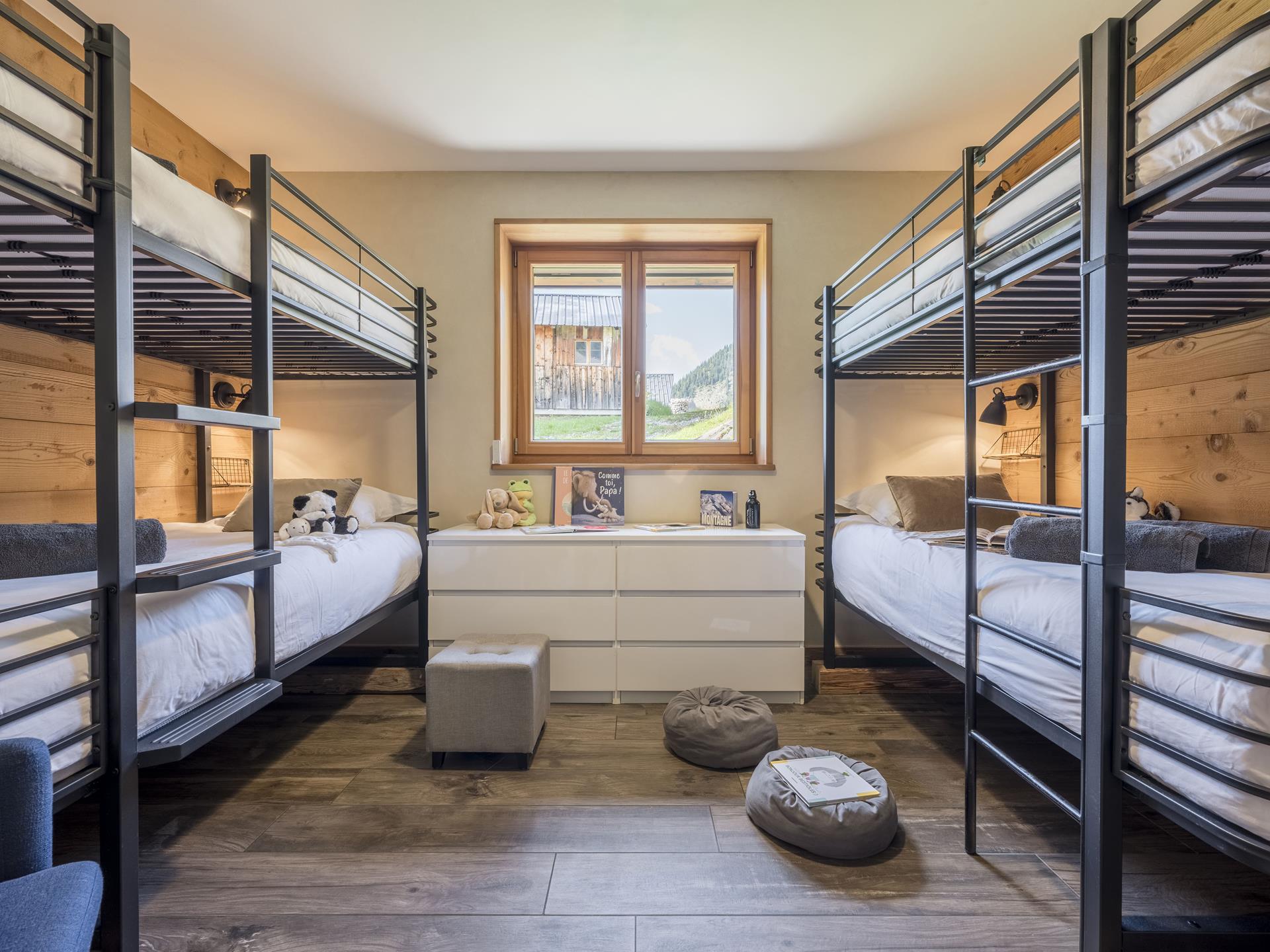 Au niveau R-2, vous trouverez les trois dernières chambres du chalet Platines : une chambre Master avec lit double et salle de bains privée, et un espace familial avec une chambre avec 2 lits simples, une chambre avec 2 lits superposés (4 couchages) et une grande salle de bains commune. Le chalet dispose également d'un espace bien-être où vous pourrez vous détendre après de longues journées en montagne : une salle de sport avec télévision et tapis de yoga, ainsi qu'un espace bien-être extérieur avec bain bouillonnant, sauna panoramique et jardin arboré.